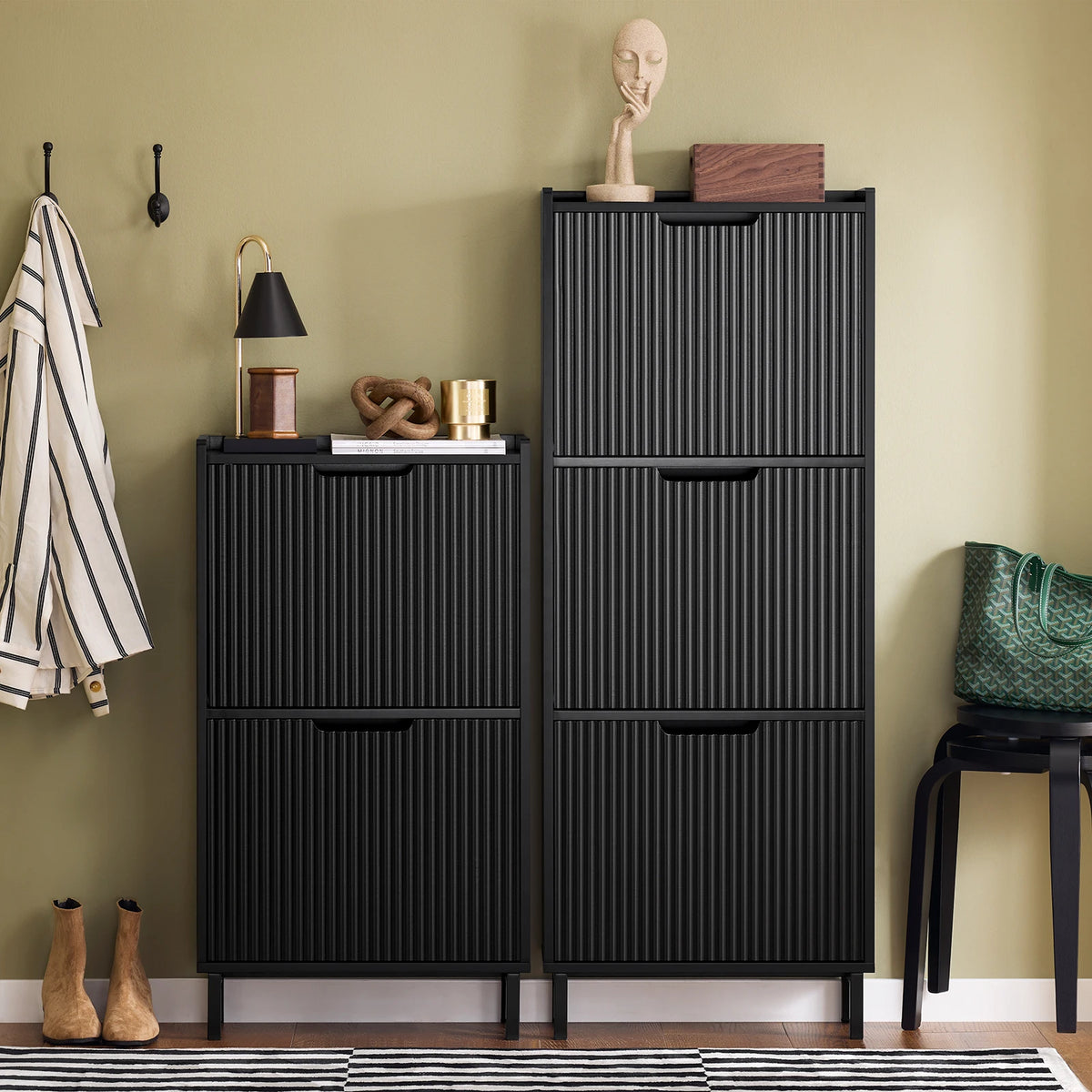 Meubles à chaussures en matériaux durables adaptés à chaque espace. Bancs compacts, armoires fermées, colonnes : privilégier la qualité sur la quantité pour un achat responsable.